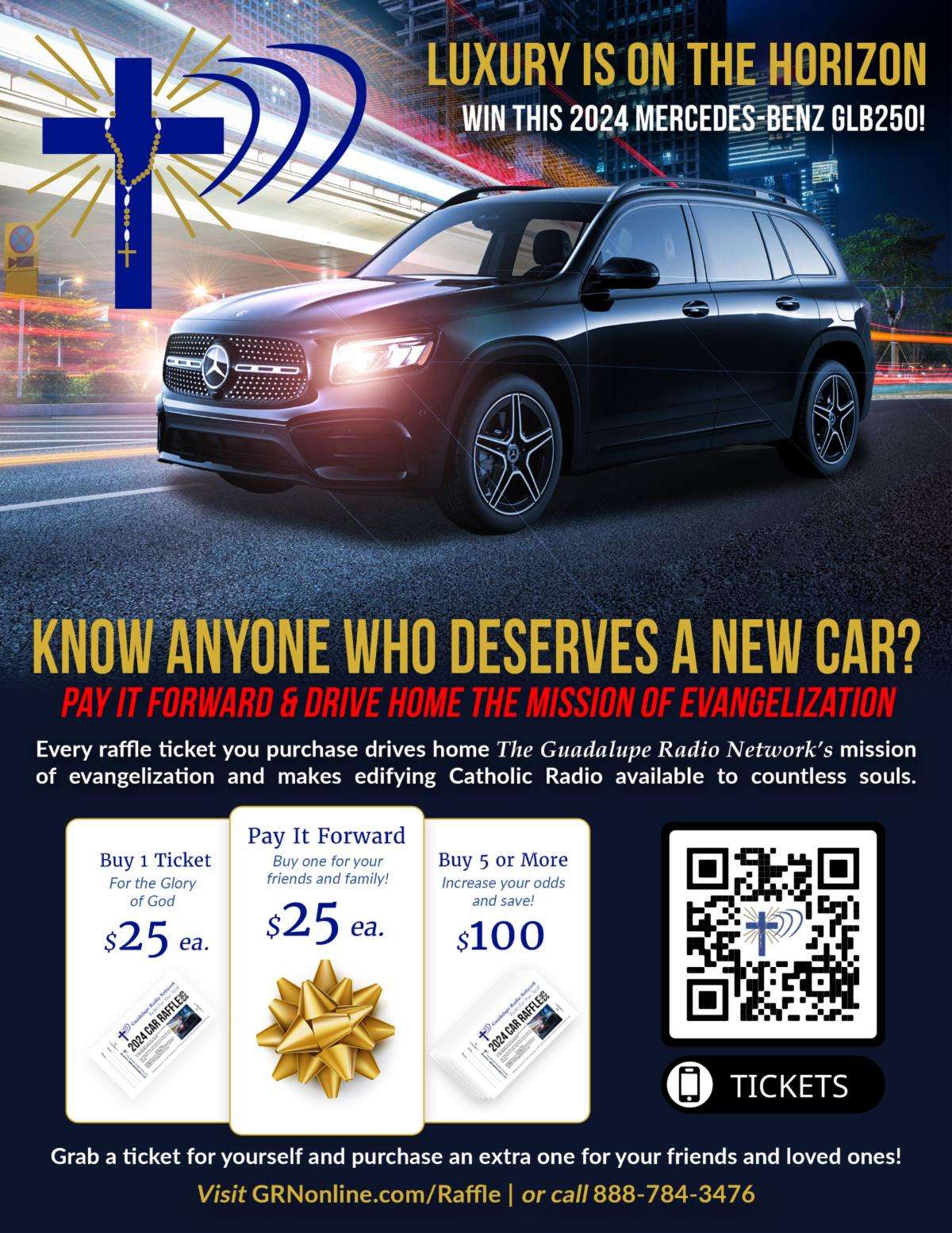 The Catholic radio station is raffling a 2024 Mercedes-Benz GLB 250 in Night Black. Tickets are $25 or 5 for $100. The winning ticket will be drawn on Friday, February 23, 2024. Please contact Stephen or Frances Zunker for tickets or scan the QR code on the flyer below.