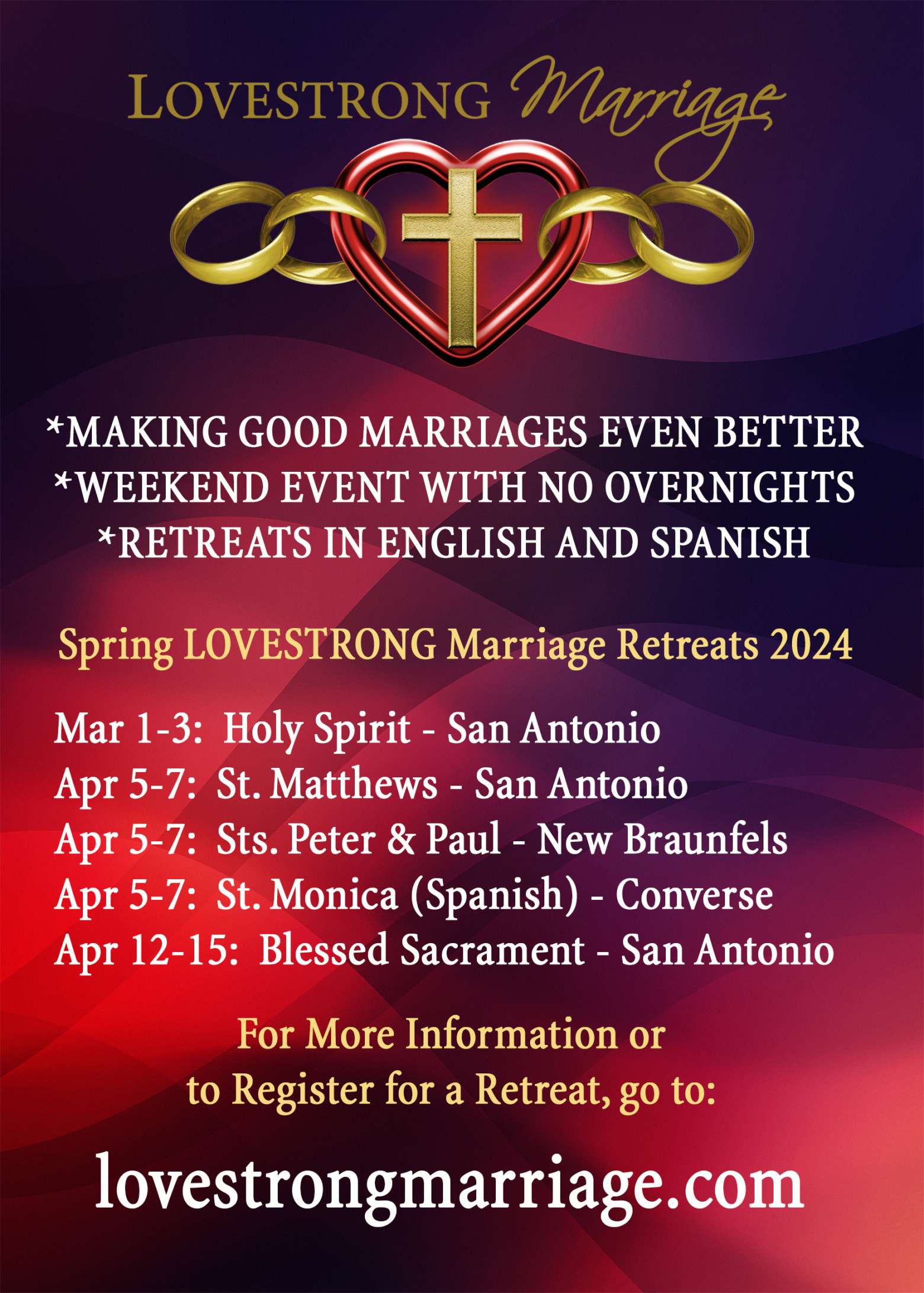 Lovestrong retreat schedule for spring is now available (see flyer below). There are flyers in the foyer with more information for those couples interested in attending this retreat.