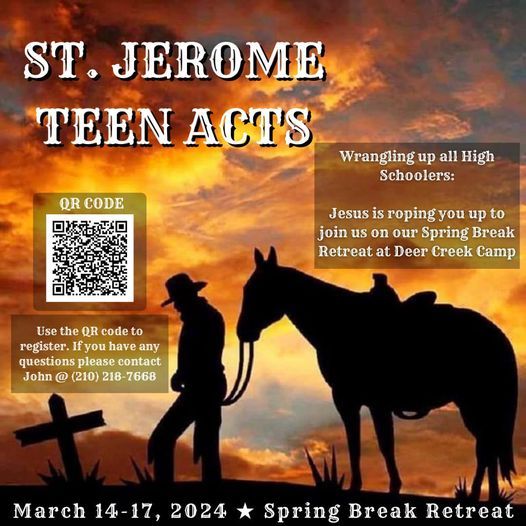Registration for the Teen ACTS retreat is now open. The online form can be accessed by going to our St. Jerome webpage or scanning the QR code in today’s bulletin or clicking on the flyer below.